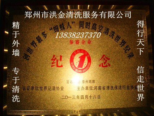 郑州市洪金清洗服务有限公司经验在多年的沉淀中升华 技术在多年的历练中成熟 服务在多年的积累中完善 率先取得甲级外墙作业施工资质以及具有独立法人资格,在河南省首家通过中国建筑物清洁委员会认证并取得会员资格的优秀企业—郑州市洪金清洗服务有限公司是一家专业从事外墙清洗服务的团队。服务热线13838237370  专业铸就品牌 诚信成就未来 服务造就辉煌  洪金清洗公司喜报连连,用生命呵护荣誉 用劳动制造财富 用智慧创造奇迹 洪金清洗公司深受广大客户的喜爱!