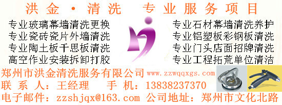 郑州市洪金清洗服务有限公司是郑州清洗公司知名品牌,是河南省首家通过中国建筑物清洁委员会认证并取得会员资格的优秀企业.郑州市洪金清洗服务有限公司专业从事:郑州玻璃幕墙清洗,郑州外墙清洗,郑州外墙清洗公司,郑州玻璃幕墙清洗公司,河南外墙清洗,河南外墙清洗公司,河南玻璃幕墙清洗,河南玻璃幕墙清洗公司,郑州专业外墙清洗,郑州保洁等服务,郑州玻璃幕墙清洗热线:13838237370.